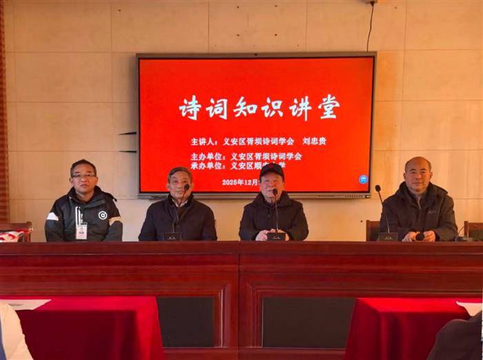 12月25日,铜陵市胥坝诗词学会应顺安中学邀请,组织开展“雅韵润心”诗词文化送教进校园专题活动。学会会长徐金喜率队,学会骨干刘忠贵老师为全校师生带来《格律诗入门与鉴赏》专题讲座,现场座无虚席,互动热烈,展现出中华诗词文化的独特魅力。