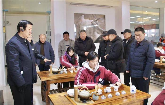 在张晋副校长的引导下,学会一行先后参观了绘画室、茶艺室、剪纸室、竹编室、界首鱼鼓教学班及雕刻班,实地感受学校非遗文化传承教育成果。在厨师教学班里,师生们现场展示的厨艺作品获得来宾一致好评。随后,一行人走进精密检测实训场所,观摩了现代化技能教学场景,最后在彩陶小院驻足,详细了解界首彩陶技艺传承与创新情况,对学校"非遗+职业教育"的特色办学模式给予高度评价。