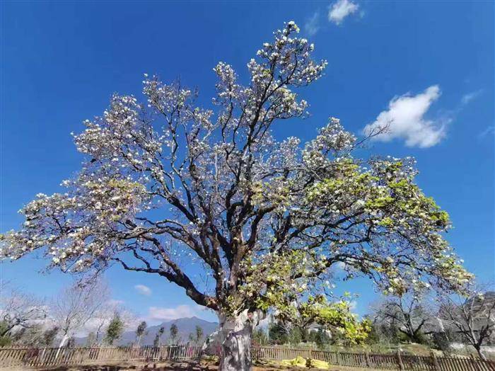千年古树苍虬立,万点繁花素影摇。