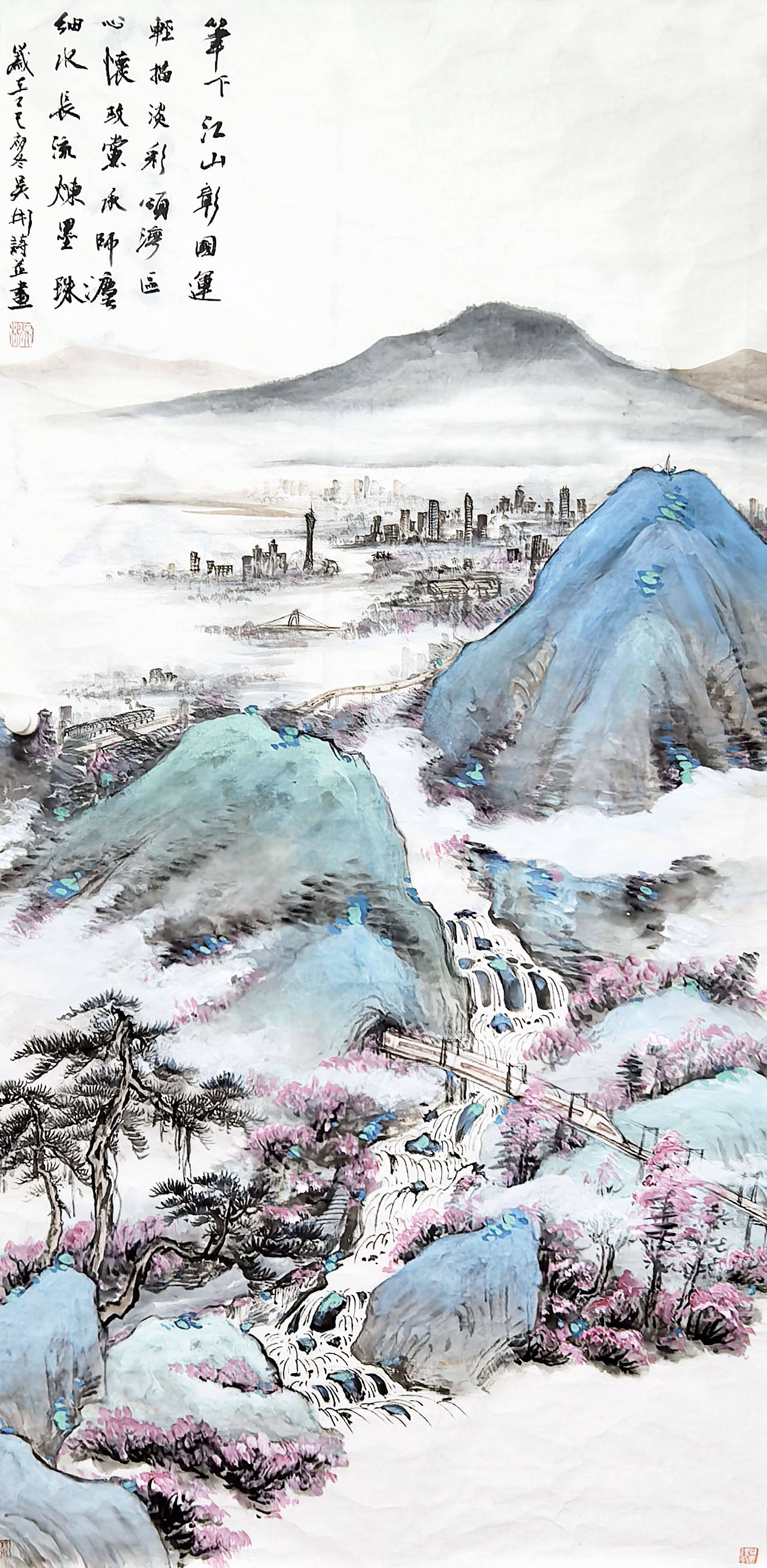 以画寄情粤港澳大湾区 七绝/吴彬 笔下江山彰国运, 轻描淡彩颂湾区。 心怀政党承师法, 细水长流炼墨珠。
