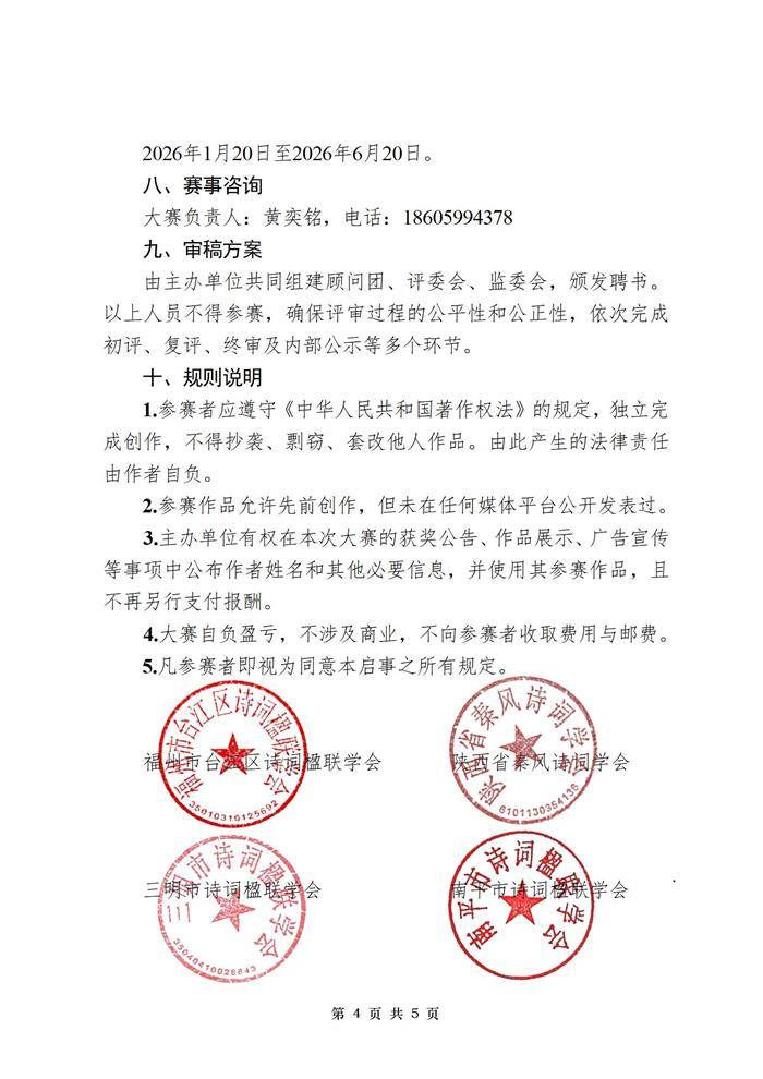 2025年,由五省七家诗词单位主办的“五省携手·诗联中秋”大赛圆满收官。今年,来自福州市台江区、陕西省、三明市、南平市、鄂尔多斯市、阜阳市、临沧市、贵定县、无为市、平武县、万安县、依安县、清远市、天长市等跨越十省十四家诗词单位,将携手举办2026年“十省携手·诗联青春”全国诗词楹联大赛。