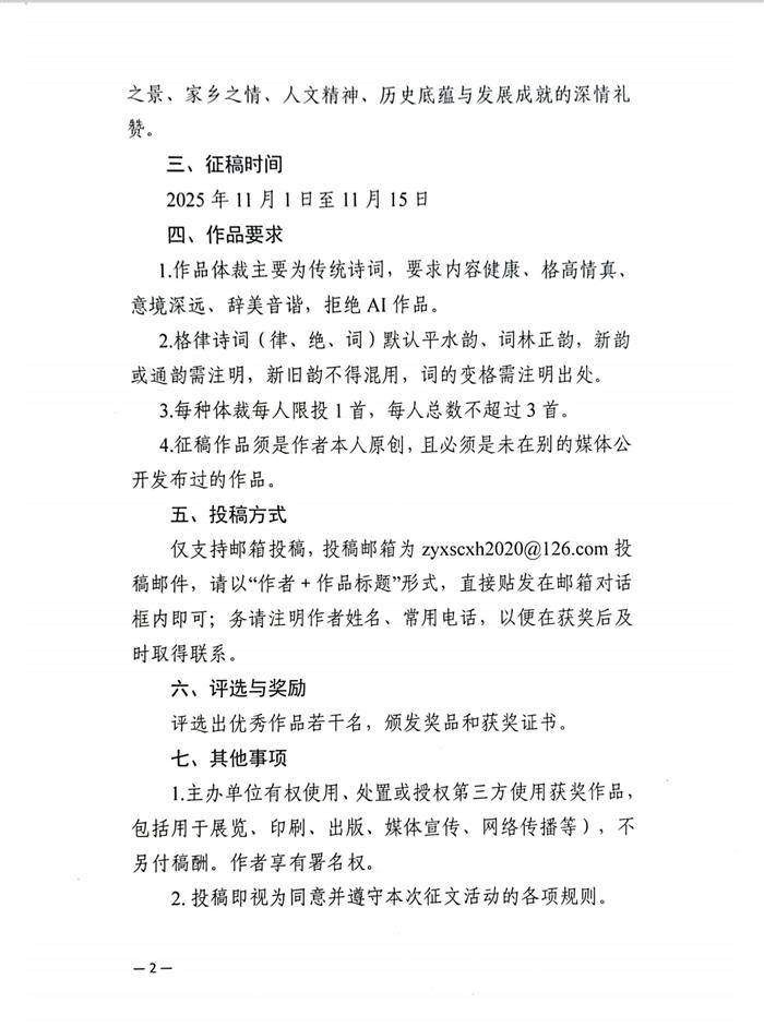 1.作品体裁主要为传统诗词,要求内容健康、格高情真、意境深远、辞美音谐,拒绝AI作品。