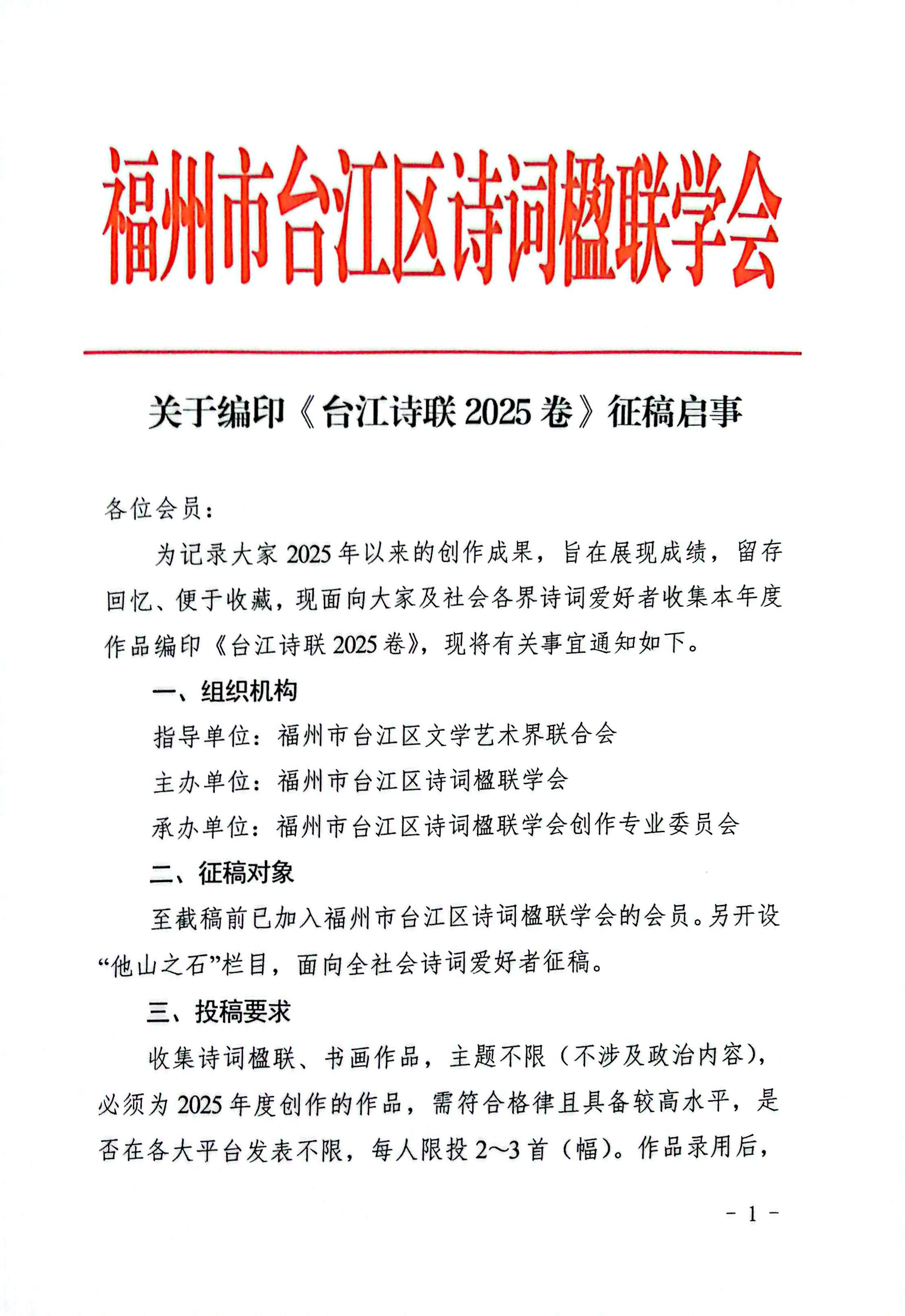 【福州市台江区诗词楹联学会】关于编印《台江诗联2025卷》征稿启事