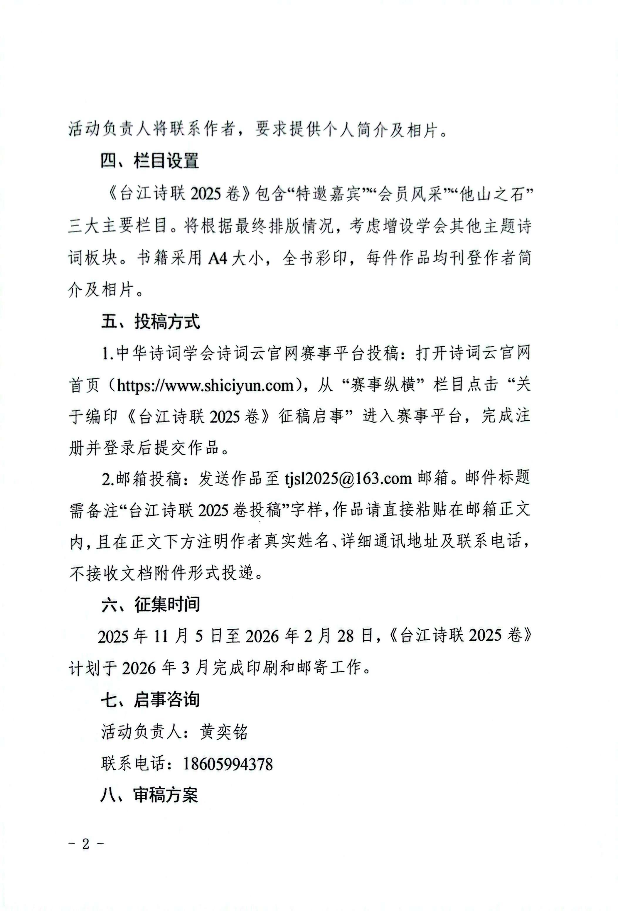 2.邮箱投稿:发送作品至tjsl2025@163.com邮箱。邮件标题需备注“台江诗联2025卷投稿”字样,作品请直接粘贴在邮箱正文内,且在正文下方注明作者真实姓名、详细通讯地址及联系电话,不接收文档附件形式投递。