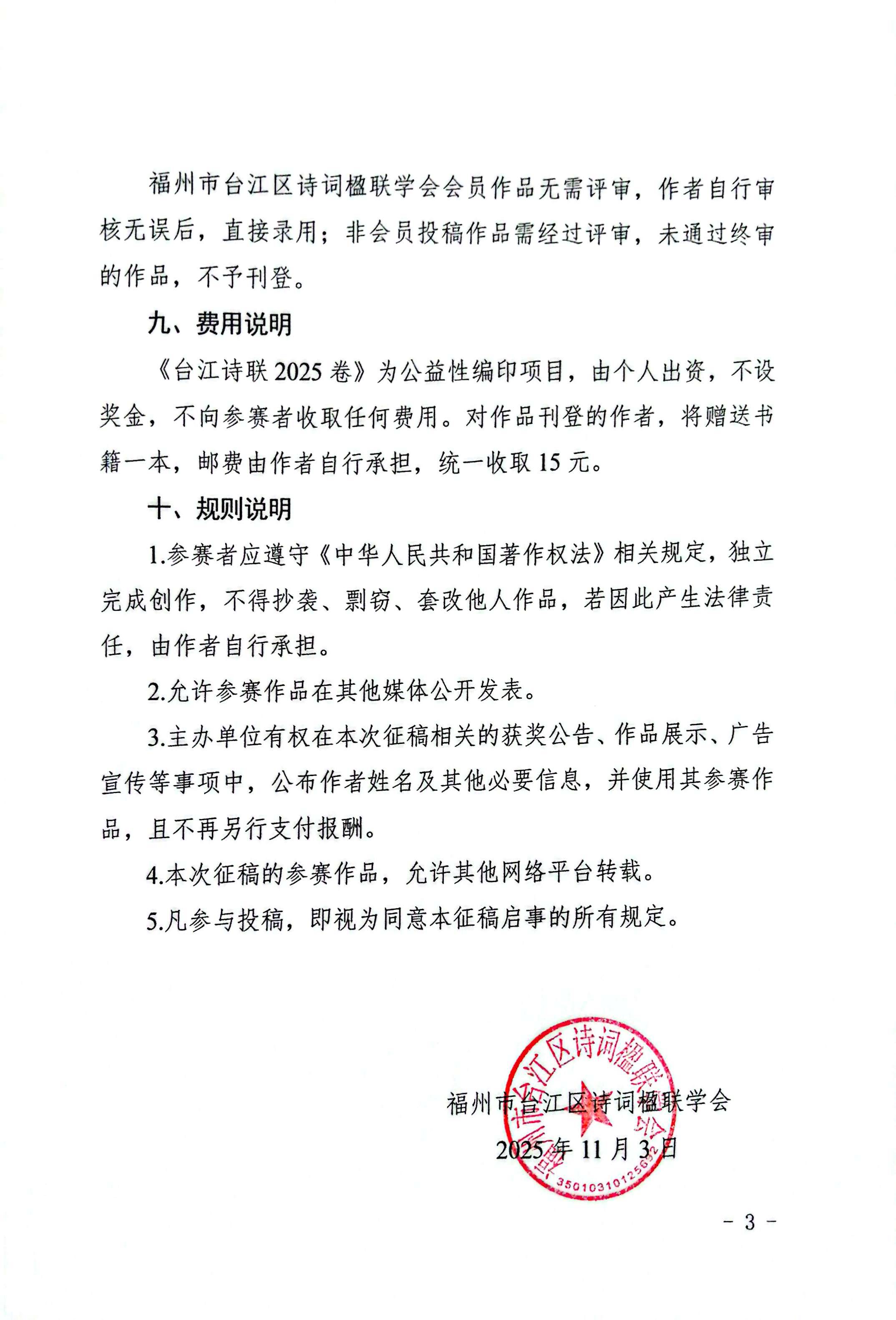 《台江诗联2025卷》为公益性编印项目,由个人出资,不设奖金,不向参赛者收取任何费用。对作品刊登的作者,将赠送书籍一本,邮费由作者自行承担,统一收取15元。
