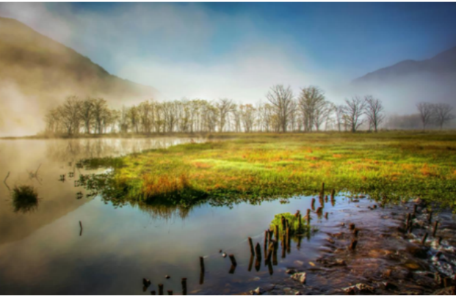 水岸堤长沙浅。对苔绿、夕阳草满。
