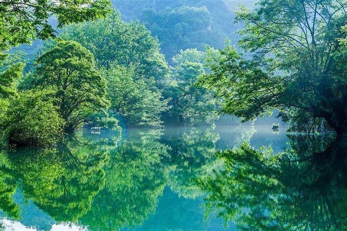 花漫山乡迎彩蝶,深潭古树舞飞禽。