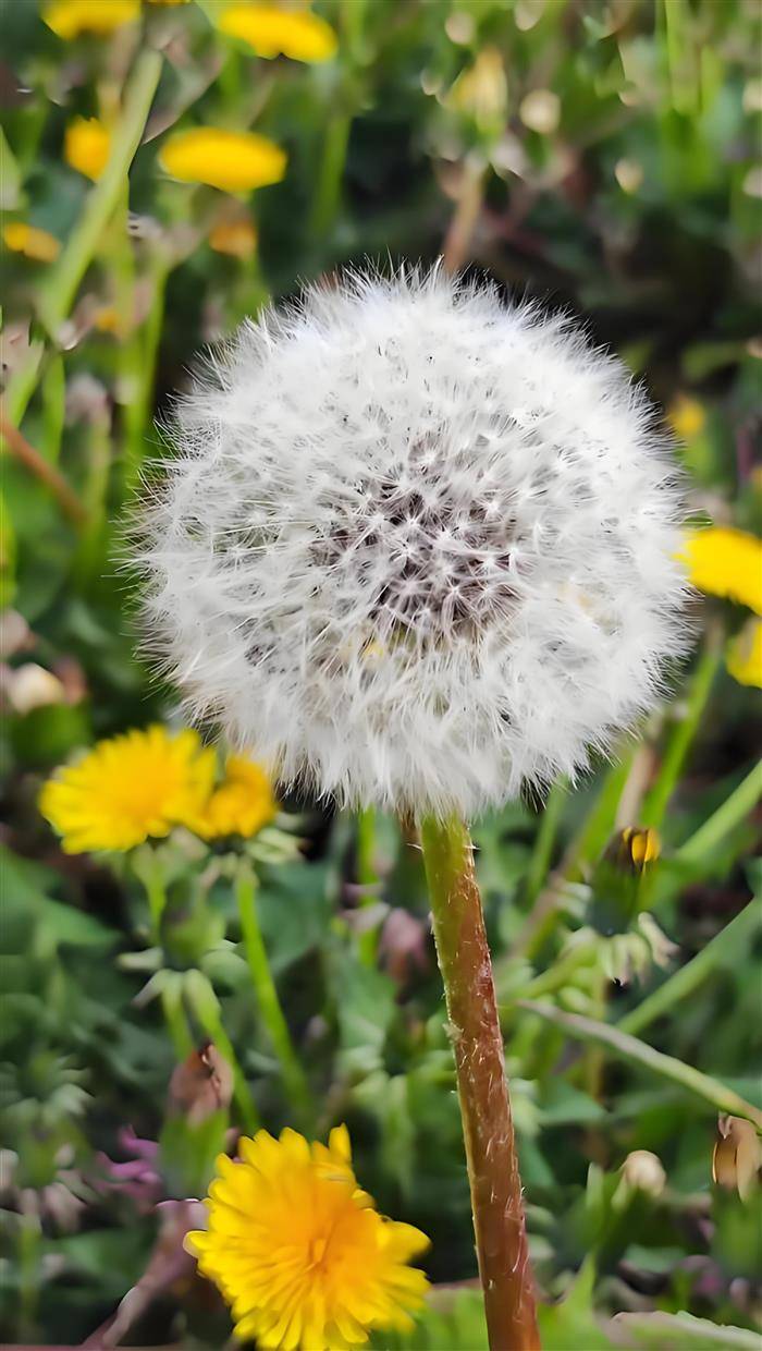 旷野生鲜蒲公英,红梗绿叶黄花萌,白绒种球超跟风,嫩叶晚餐凉拌烹。