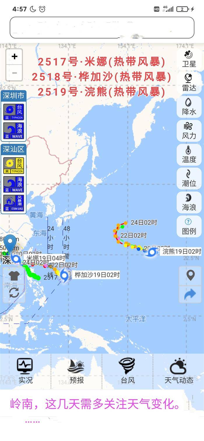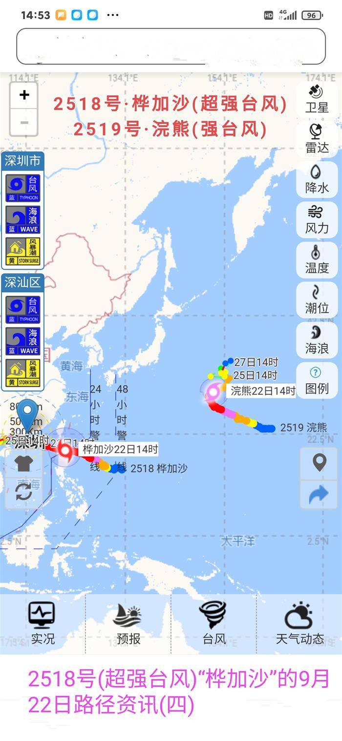 2518号超强台风已经在9月22日14时进入到中国24小时警戒线。现在是两台风同现(太平洋西侧)。