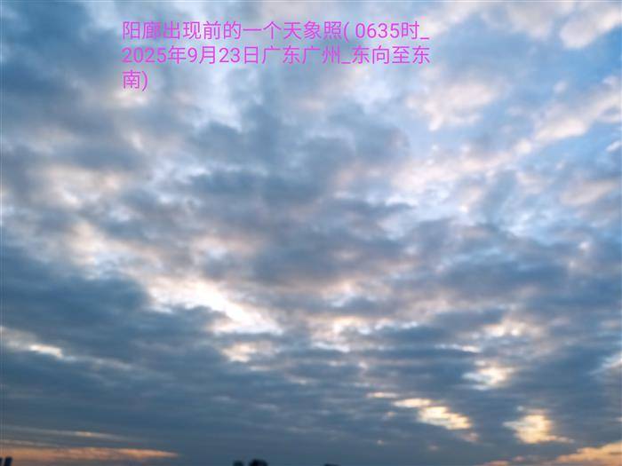 【 ^ 2025年9月22日早上6时15分至6时21分,广东省广州市正东方向的一个天象照片。此时,灰云、厚云遮着太阳,不见日影。9月22日,广州正常的日出的开始时间是在早上6时15分至6时16分之间。也就是说,这是:迟现日影、迟现日出的天象,阳廓迟现、日辉迟到的天象。】