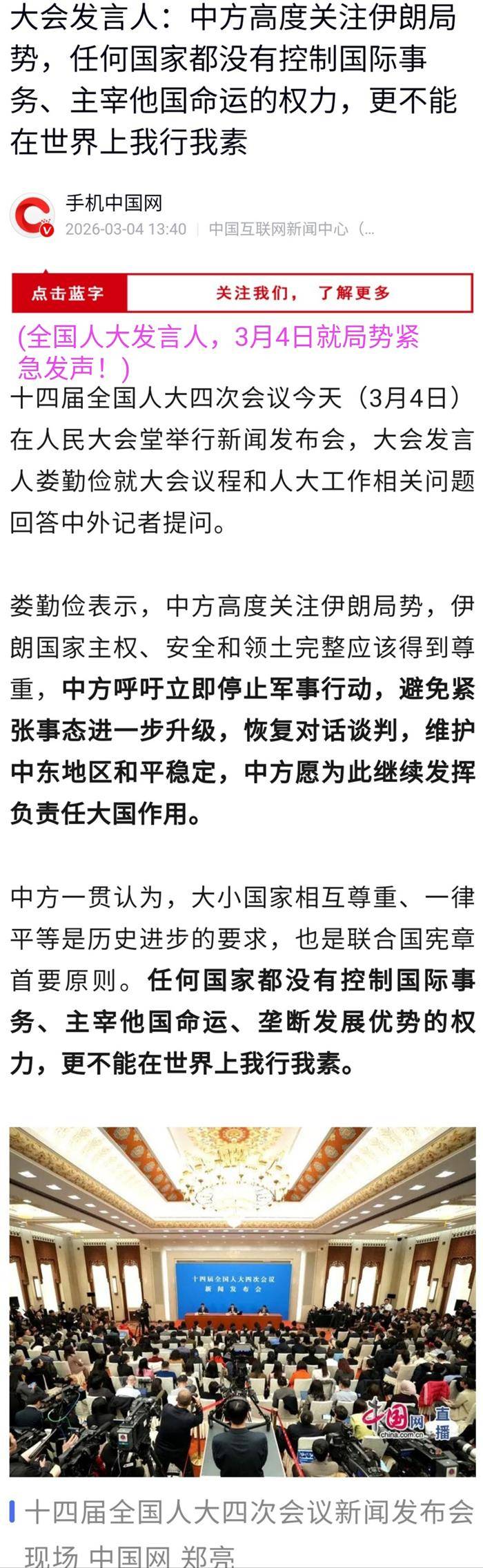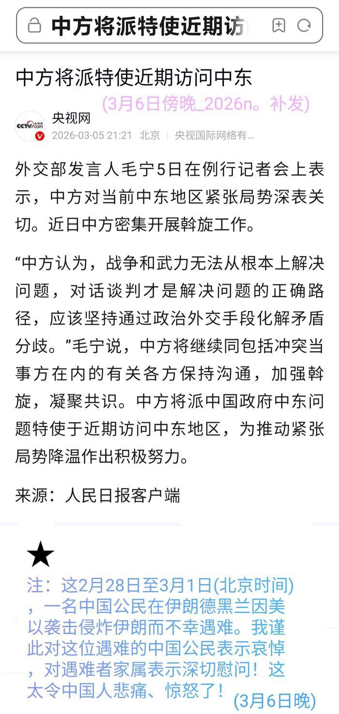 (这在2026年3月5日晨6时45分发出。这是转录3月4日中午1时多中国公共媒体发布的内容。)