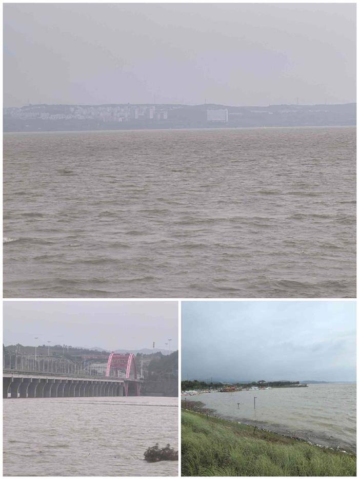 注释:(汉江)水势茫茫且风大、浪涌,水中凸起的陆地被淹没这天都没见了。曾经一望无际的碧水如今浑浊像换上铺的黄地毯,挡水的堤岸被水淹成齐腰深,桥下风大被吹得呜呜作响。