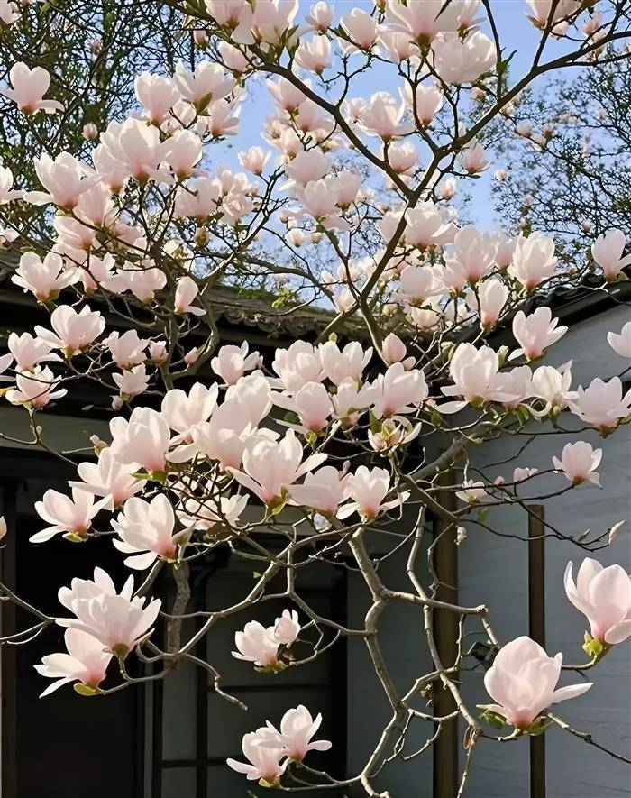 学校家属楼前有一排玉兰树,树梢超过了三层楼,枝繁叶茂,印象中在我调到学校来之前就有了,为了让它们茁壮成长,把旁边高大而且落叶烦人的水杉树都砍掉了。