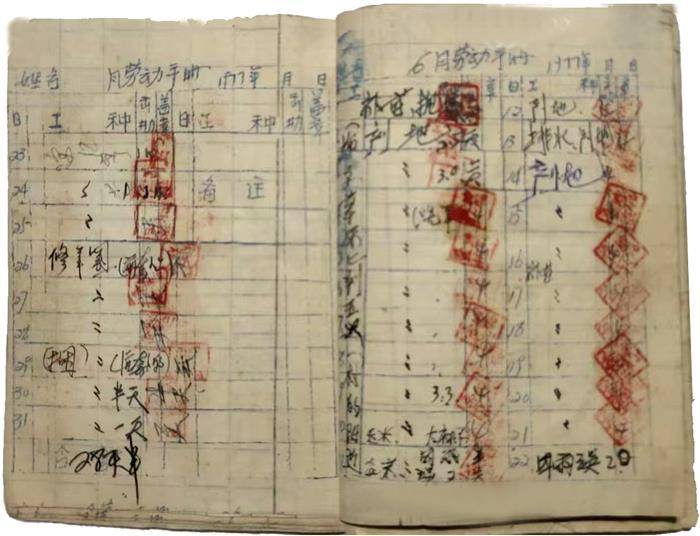 平水韵,平起首句押韵。作者经历人民公社时代,当时在农村参加劳动,是不用钱发工资的,而是队里到公社用机关的油印机打印或到县印刷厂印制社员记工册,然后发给社员,人手一册。每天收工时由小队长或组长在工分册上签字盖章(通常一天记八分,有的记件而记得略高),作为年底统计依据。