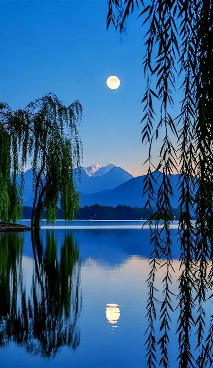 作者常到湖边散步,面对湖光月色,目视沉沉下垂的长长的垂柳,富有诗情画意,抒发作者对大美自然的深深的感触。