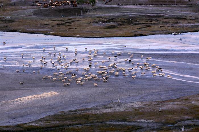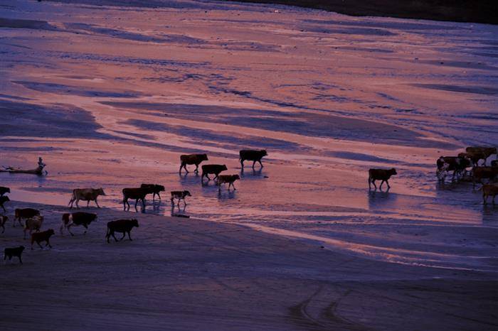 水浅沙柔天色暮,牛羊涉渡自知归。