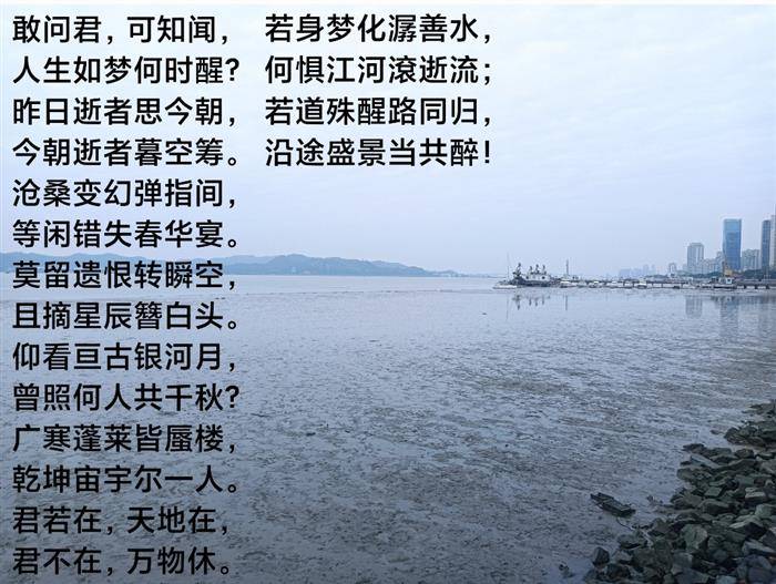 敢问君,可知闻,人生如梦何时醒?昨日逝者思今朝,今朝逝者暮空筹。沧桑变幻弹指间,等闲错失春华宴。莫留遗恨转瞬空,且摘星辰簪白头。仰看亘古银河月,曾照何人共千秋?广寒蓬莱皆蜃楼,乾坤宙宇尔一人。君若在,天地在,君不在,万物休。若身梦化潺善水,何惧江河滾逝流;若道殊醒路同归,沿途盛景当共醉!