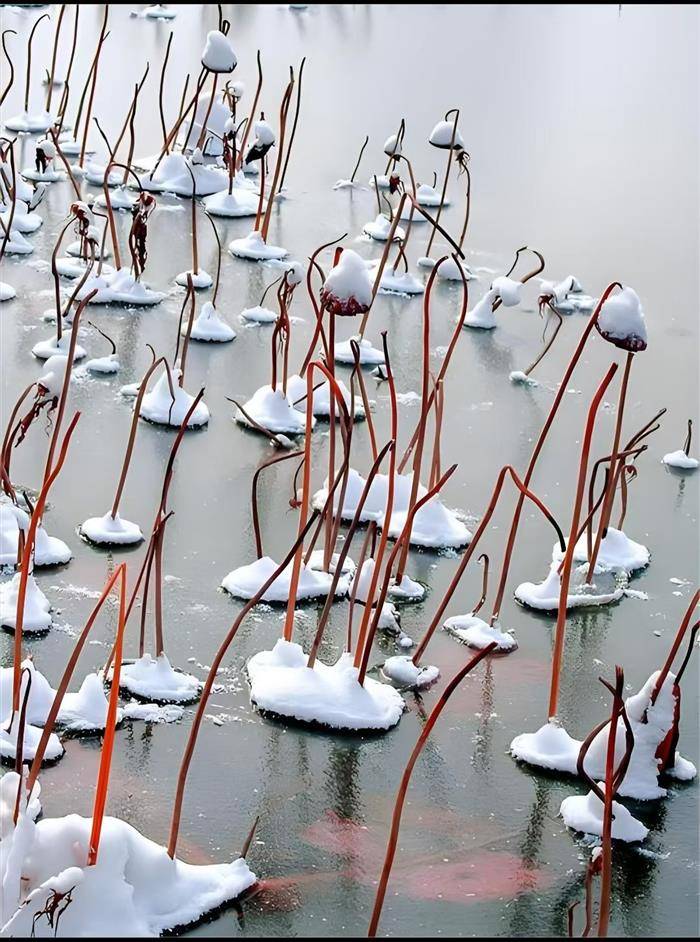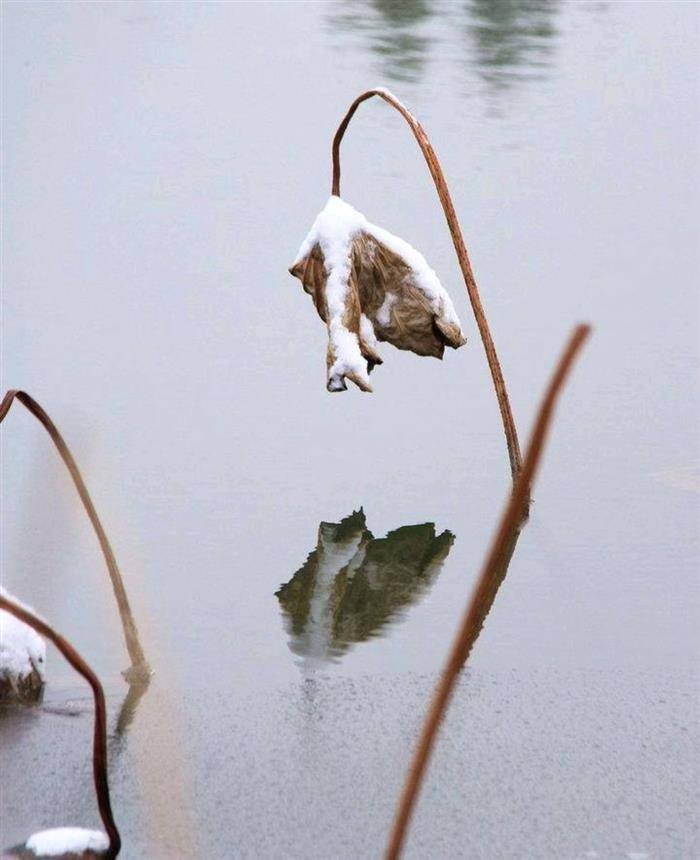 荷塘岁首雪潇潇,残盖凝脂翠已凋。