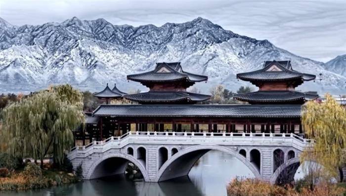 飞檐斗拱垂云影,曲榭回廊沐夕曛。