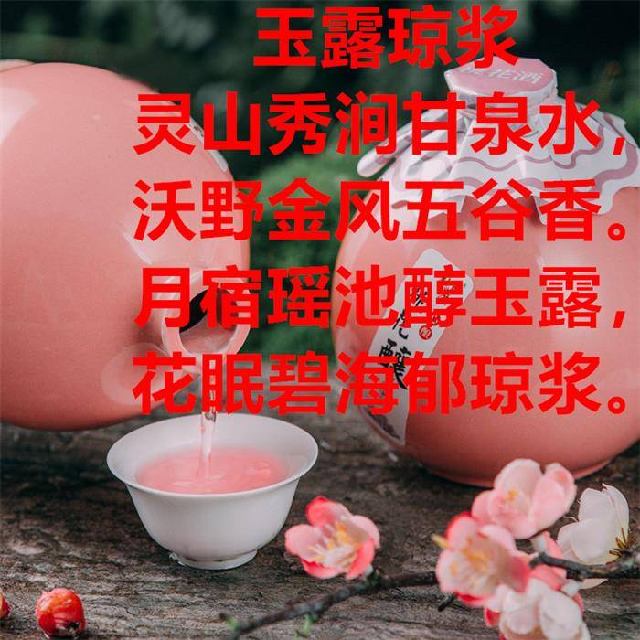 注释:灵秀的山峰和峻峭幽远的山涧喷涌着甘洌的泉水,流动着彩霞的肥沃田野上,丰收的五谷散发着醉人的香气。人们收获五谷并用来酿造美酒,月光透过酒坊的窗户散落在发酵与陈化老熟过程中的酒池上,使醇造出的酒的风味象天上降落的玉露一样甘洌悠长,含蕊的花苞与盛放的花瓣散落在陈酿好的酒海中,使琼浆般的酒增添了果味花香,使酒的风味更加丰富绵长。