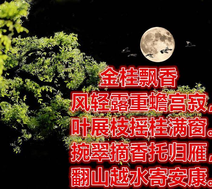 注释:中秋之夜微风轻轻吹过,浓重晶莹的露水滋润着桂花树,抬头看着天上的月亮,天宫寂静一片,桂树枝舒叶展挂满窗户。随手摘下翠绿的桂叶和芳香浓郁的桂花,把这些香翠化作祝福,让南去的鸿雁把祝福寄给远方亲朋。