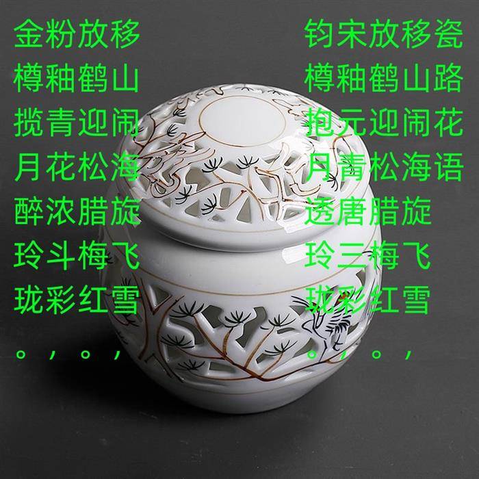 一,到山上采集瓷土原料以移山作喻,二,淘瓷泥用闹海作喻,三,拉坯和修坯用旋飞雪作喻,四,在瓷坯上绘画人物山水鸟兽做陶瓷点睛之笔,用引鹊登枝戏桃红或放鹤迎松腊梅红或放鹤迎松点梅红作喻,五,上釉工艺,用宋釉元青唐三彩或粉釉青花重斗彩作喻,六,陶瓷成品器形名称,用钧樽抱月透玲珑或金樽揽月醉玲珑作喻。