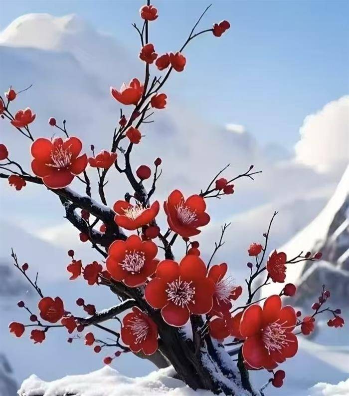 序:首届“古韵承东山 诗心聚海潮”校园诗词大赛启幕之际,适见雪岭红梅图。寒英破玉,恰似少年诗心凌霜初绽;绛萼燃空,正如文脉星火映潮而兴。因以七律兼咏二美,寄意家乡雏凤清声。