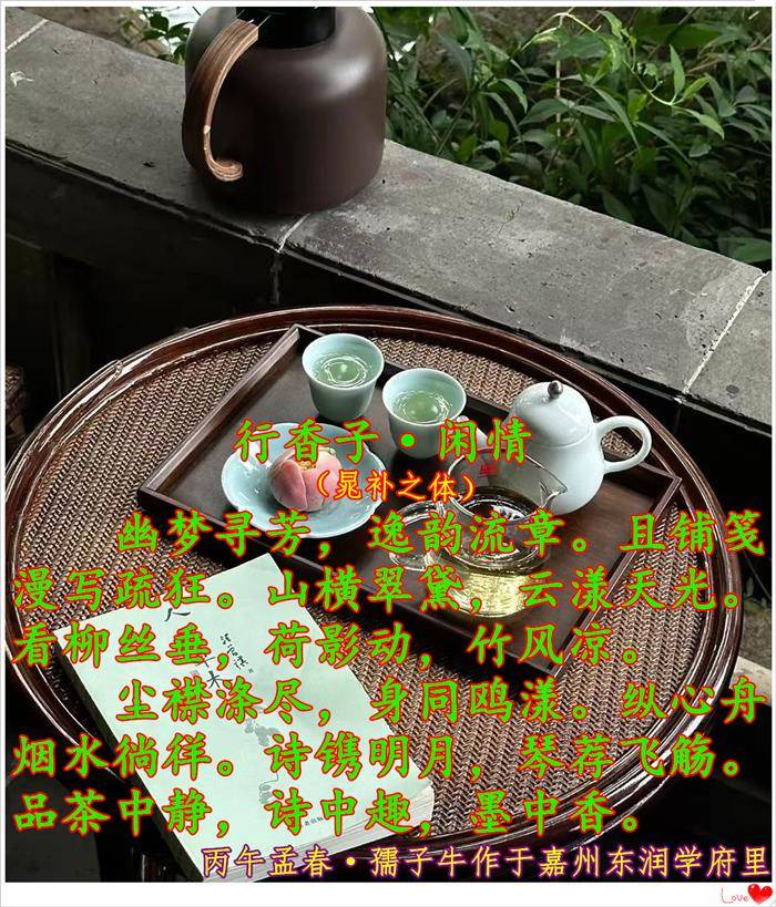 尘襟涤尽,身同鸥漾。纵心舟烟水徜徉。诗镌明月,琴荐飞觞。品茶中静,诗中趣,墨中香。