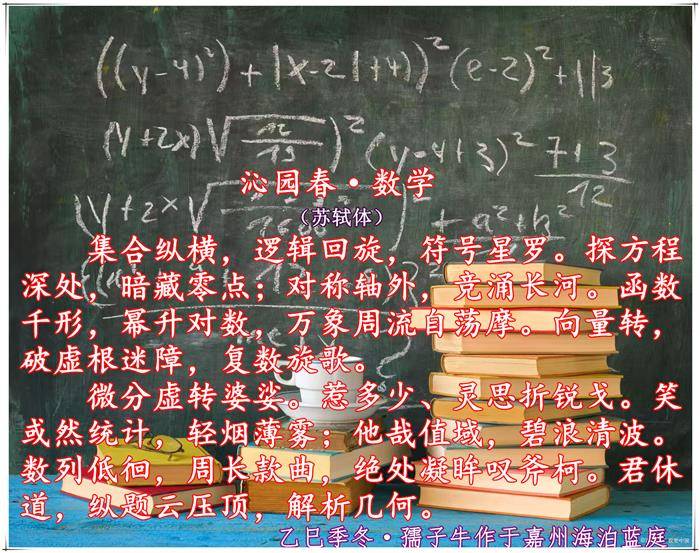 集合纵横,逻辑回旋,符号星罗。探方程深处,暗藏零点;对称轴外,竞涌长河。函数千形,幂升对数,万象周流自荡摩。向量转,破虚根迷障,复数旋歌。