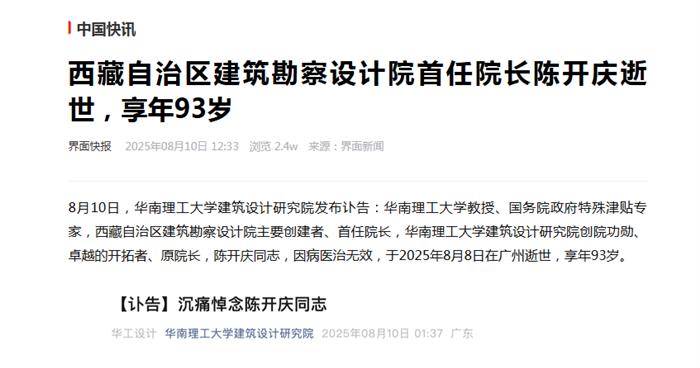 乙巳年八月十日亥时,华工网站兹以沉痛谨告:本校教授、国务院特津耆宿,西藏建勘院肇基之主、首任院长,华工设计院创院元勋、开拓巨擘、原院长陈开庆同志,痼疾弗愈,于乙巳年八月八日薨于穗,享寿九十有三。