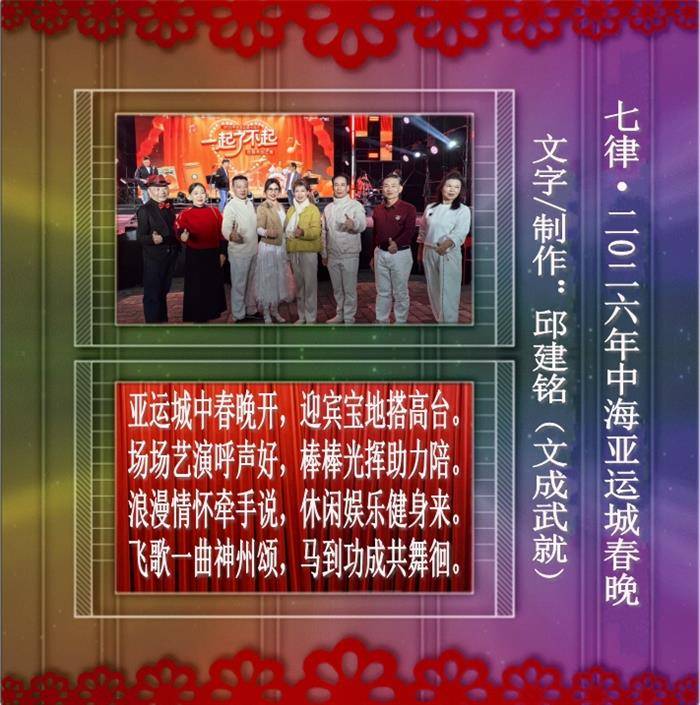 七律·2026中海亚运城春晚 文/邱建铭(文成武就) 一、 春晚华灯耀广场,传承太极谱新章。 情牵浪漫和歌起,邻睦升平笑语扬。 导演巧编成妙构,匠心对白诉衷肠, 闲谈趣味相娱乐,彻夜狂欢盛世昌。 二、 亚运城中春晚开,迎宾宝地搭高台。 场场艺演呼声好,棒棒光挥助力陪。 浪漫情怀牵手说,休闲娱乐健身来。 飞歌一曲神州颂,马到功成共舞徊。