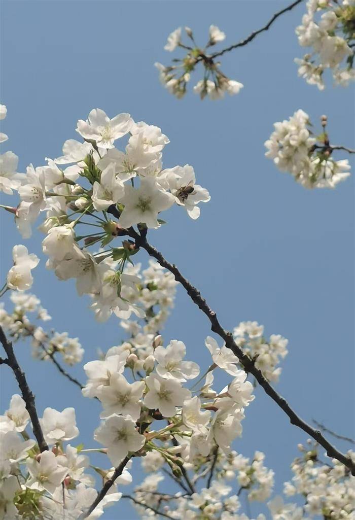 周末河边闲游,梨花随风而落,空惹记忆旧愁。