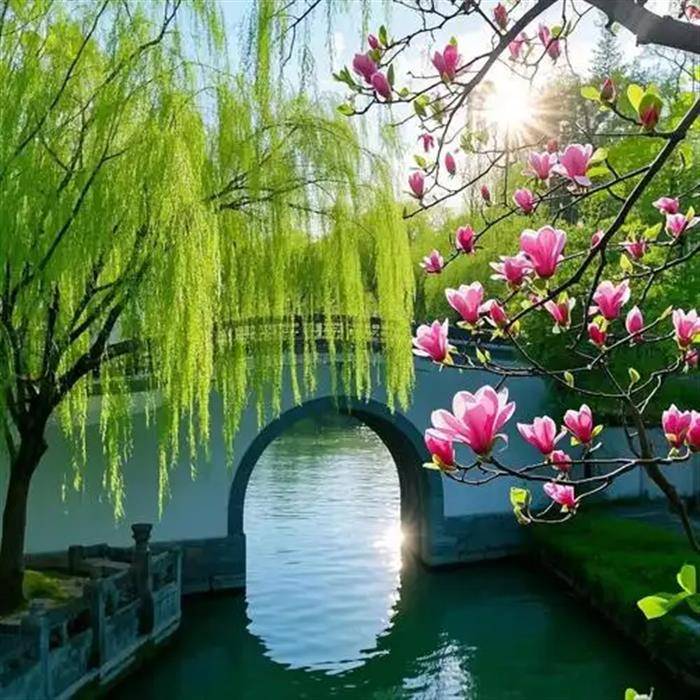 纤纤翠柳柔丝舞,曲曲清溪幽径循。