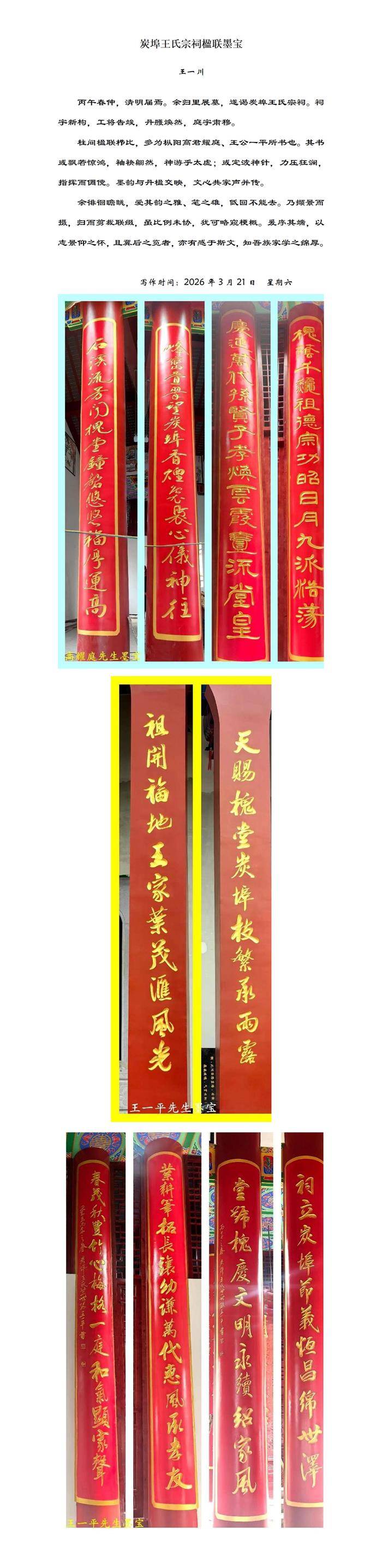 丙午春仲,清明届焉。余归里展墓,遂谒炭埠王氏宗祠。祠宇新构,工将告竣,丹雘焕然,庭宇肃穆。