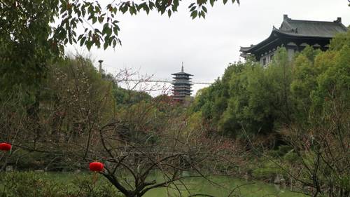 双蜂惹飞絮。塔影含情,根雕荔园佳处。