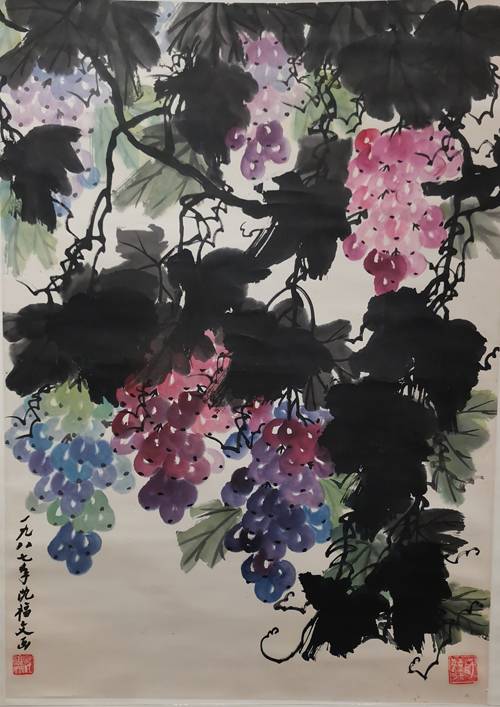 叶下枯枝,嫩丝緾绕,累累硕果含紫。翡翠葡萄,酒香墨绿,尽染冰晶珠蕊。剪裁梳理,浓淡色,参差交汇。青翠芬芳点缀,藤蔓丛影经纬。福文诏安漆艺,夏曦盘、彩绘元气。神女峰前三峡,六蝉嬉戏。风物江山吐瑞。醉初醒,天明清影起。研墨花田,愁肠老泪。