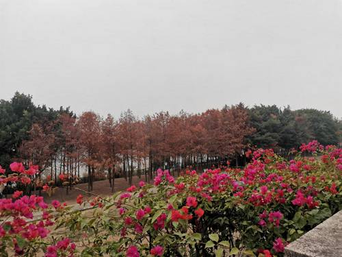 粉黛草烟迷泪眼,水杉紫气霓红薄。