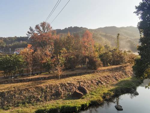 桥起南阳钓月游。枫映池塘红叶浮。村中乐忘忧。雅居藏一丘。