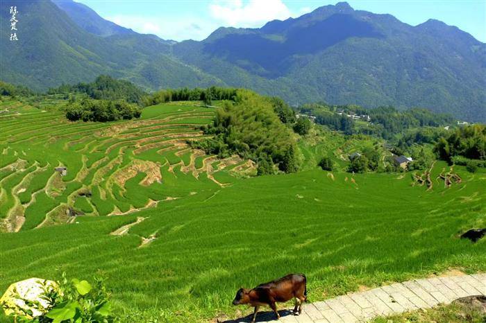闲牛慢踱烟霞径,万级云梯缀彩裳。