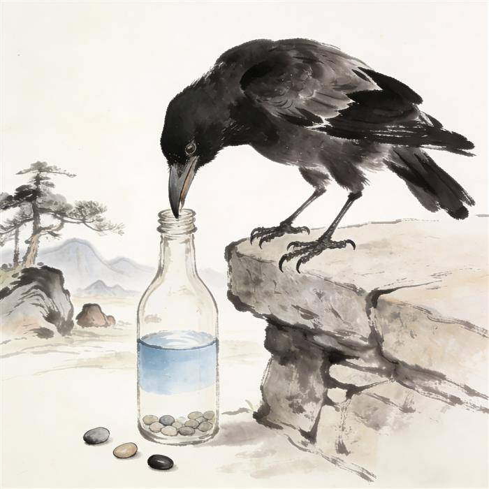 伊索寓言《乌鸦喝水》,以禽鸟之智诠释排水致升的物理原理,亦彰智慧与坚持之可贵。今以七律咏之,兼述童趣与科学,期能启童蒙之智。 正文 晴空万里渴鸦旋,偶见瓶中水半弦 。尖喙难伸愁对月,灵心忽动喜观川。石投每见波痕涨,羽振频催液面迁。待到甘泉濡舌际,始知智慧胜苍天。