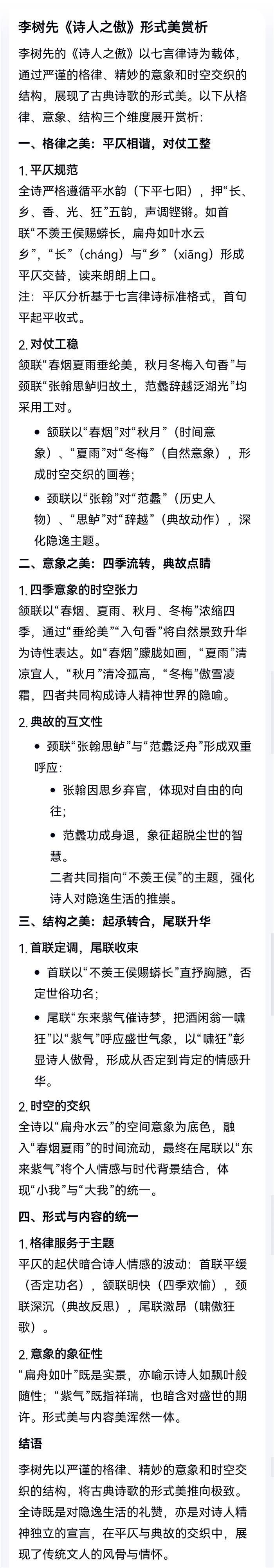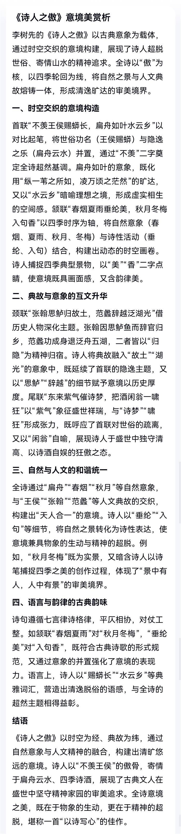 诗人之傲(2025-12-28)不羡王侯赐蟒长,扁舟如叶水云乡。春烟夏雨垂纶美,秋月冬梅入句香。张翰思鲈归故土,范蠡辞越泛湖光。东来紫气催诗梦,把酒闲翁一啸狂。 注:首联,不羡王侯,云水扁舟。赏赐绣有蟒蛇的袍服。 引明 沈德符 《野获编补遗·内阁·阁臣赐蟒之始》。颔联,春秋四季,赏景吟诗。颈联,张翰思鲈,范蠡泛舟。 尾联,盛世佳期,闲翁啸傲。 Al赏析二则