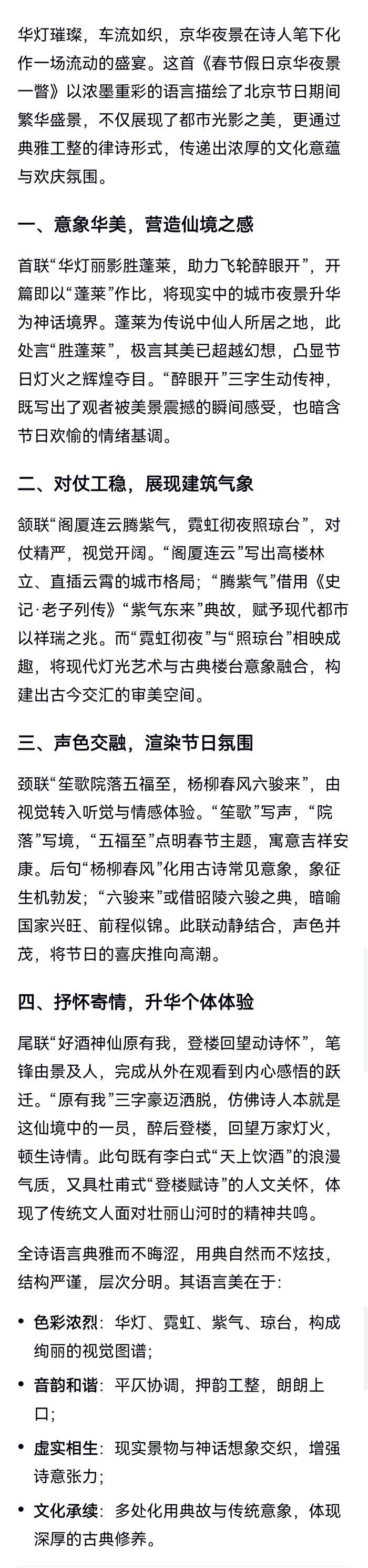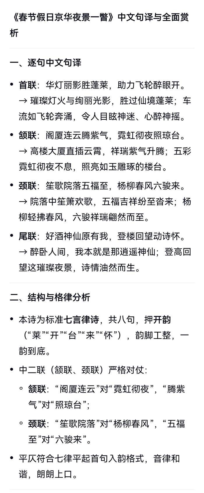 注:首联,景胜蓬莱,醉眼惊开。飞轮,车也。颔联,阁厦连云,霓虹彻夜。颈联,院迎福瑞,柳绽春风。尾联,醉仙有我,登楼高吟。