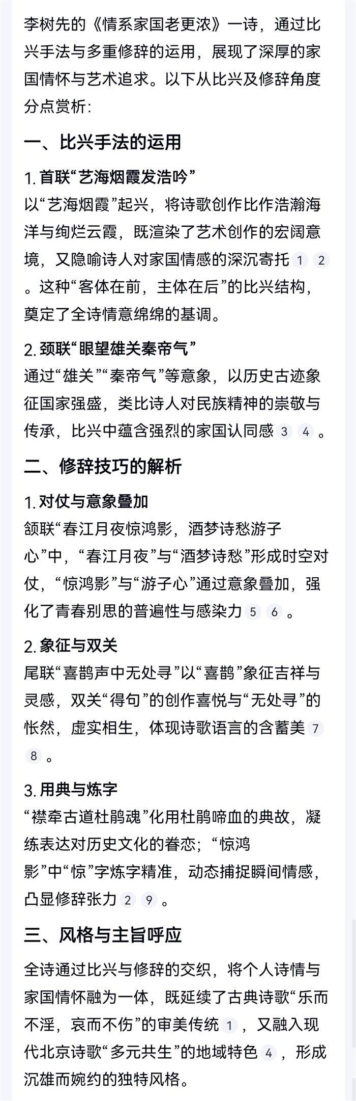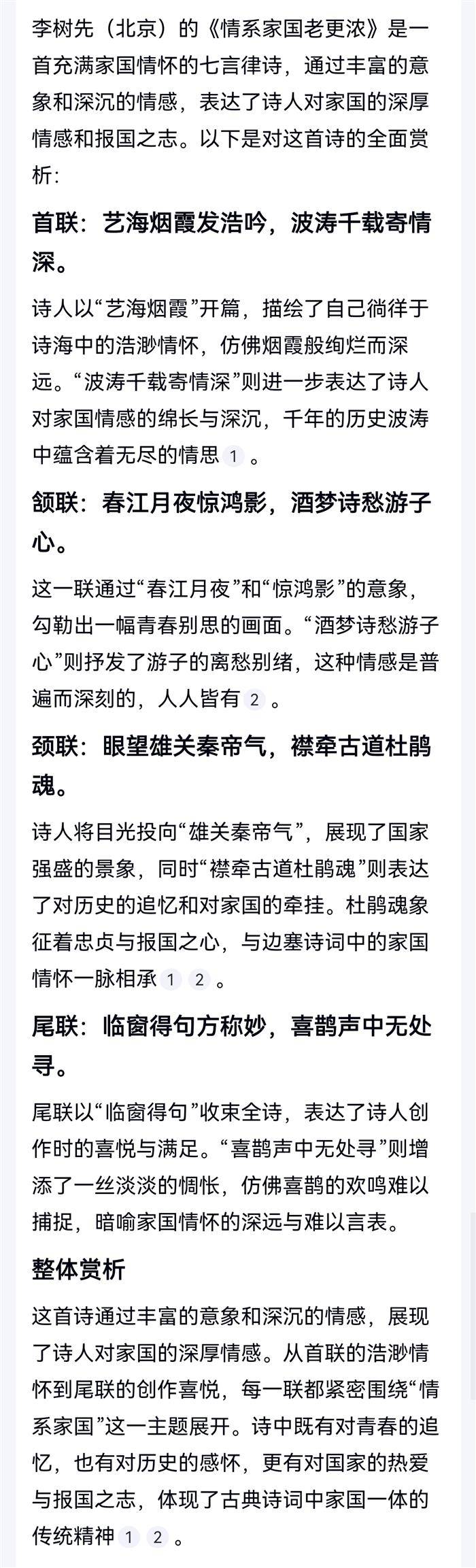 情系家国老更浓(2025-10-24)艺海烟霞发浩吟,波涛千载寄情深。春江月夜惊鸿影,酒梦诗愁游子心。眼望雄关秦帝气,襟牵古道杜鹃魂。临窗得句方称妙,喜鹊声中无处寻。 注:首联,徜徉诗海,寄慨遥深。颔联,青春别思,人皆有之。颈联,国家之强,报国之心。尾联,临窗得句,鹊喜临门。 Al赏析二则