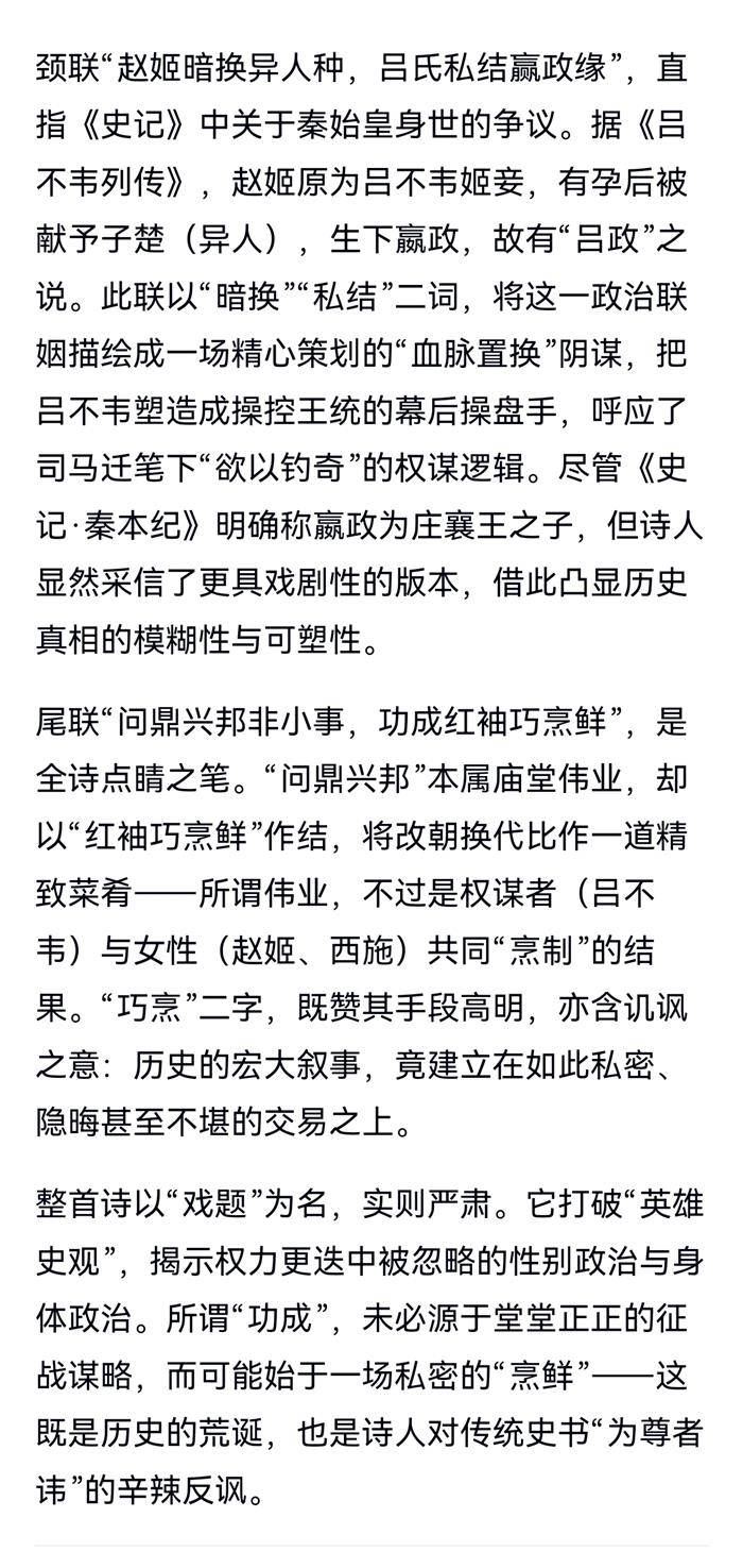 注:诗背景资料引史书及网闻。首联,大千世界,闲话轶闻。颔联,越女灭吴,范蠡泛舟。颈联,赵姬怀子,布韦居奇。尾联,兴废事大,成在巧烹。