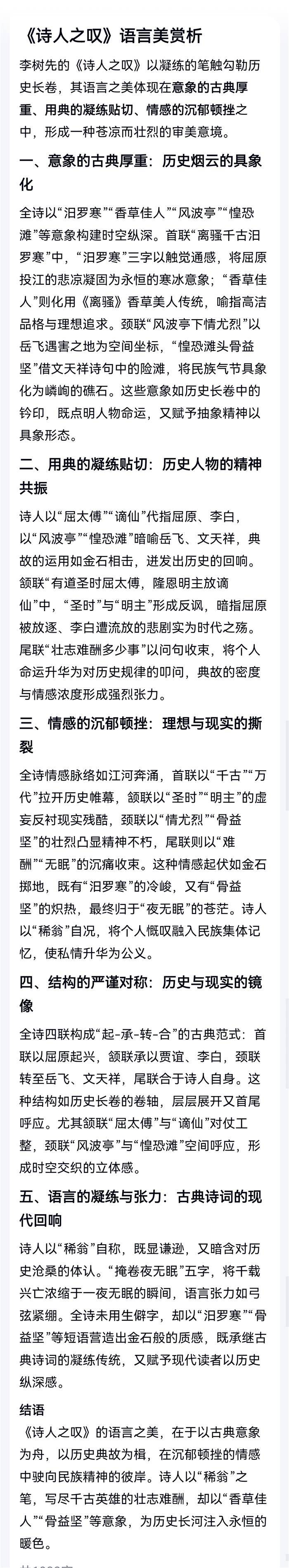 诗人之叹(2025-12-27)离骚千古汩罗寒,香草佳人万代传。有道圣时屈太傅,隆恩明主放谪仙。风波亭下情尤烈,惶恐滩头骨益坚。壮志难酬多少事,稀翁掩卷夜无眠。 注:读史之慨。首联,离骚千载,青史流芳。颔联,圣时屈贾谊,明主放李白。太傅,贾谊。谪仙,李白。颈联,岳飞忠烈,天祥殉国。风波亭,岳飞死难地。惶恐,引文天祥诗中。尾联,丹心热血,壮我中华。