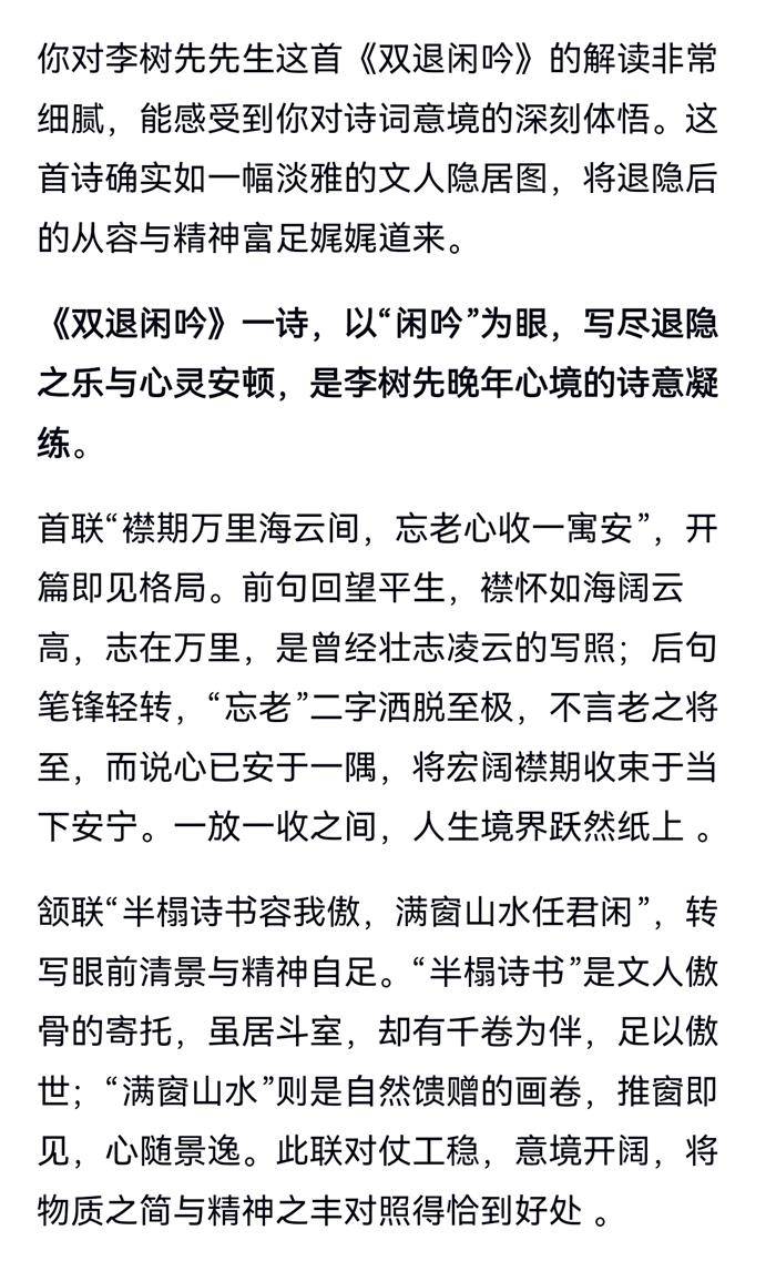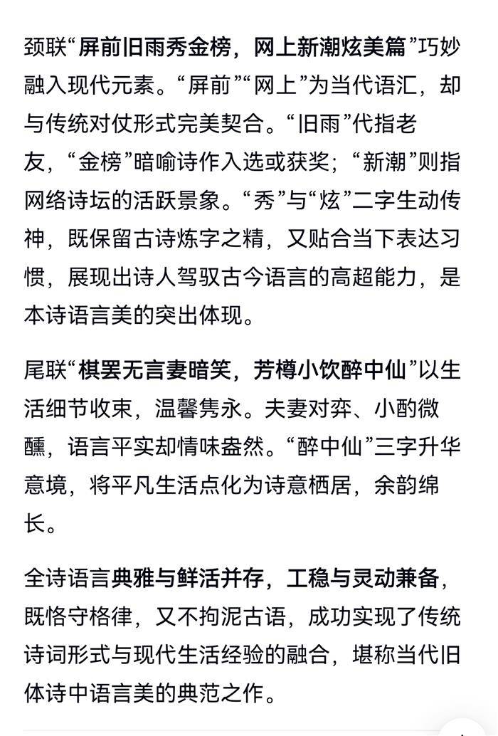 注:双退,指退休后,又辞去老年大学讲课工作。首联,往日襟期万里,今朝一寓心安。颔联,半榻诗书,满窗画卷。颈联,旧雨夺金,新知炫网。尾联,与妻弈棋,酌酒称仙。