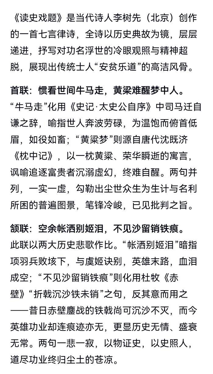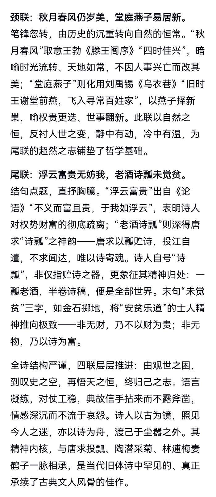 注:文中引古史诗文中相关典故。首联,为温饱而牛马走,为富贵而梦黄粱。颔联,霸王别姬,赤壁销铁。颈联,美景四时,燕子择居。尾联,老酒诗书,安贫乐道。