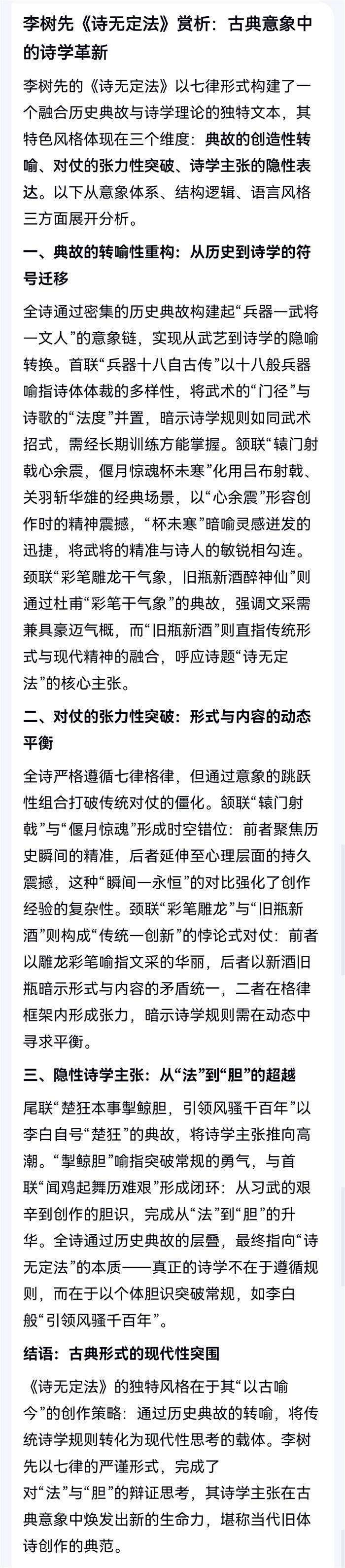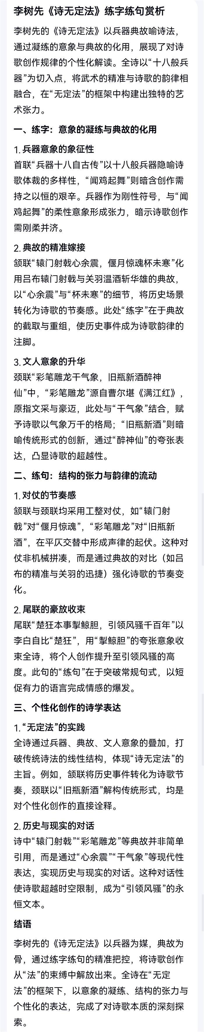 注:诗无定法,主旨在于诗写规律之外的个性化。  首联,习武门径十八般,喻诗体裁若干种。  颔联,吕布射戟之精准,关羽斩华雄之神速。引辕门射戟,温酒斩华雄故事。  颈联,子美彩笔干气象,太白醉写泣鬼神。“彩笔雕龙”出自清代诗人曹尔堪的《满江红》,原句为“彩笔雕龙官阁里,短衣射虎边亭上”,形容文采斐然与豪迈气概兼具的文人形象。 尾联,谪仙豪气干云,千载引领风骚。楚狂,太白自称。