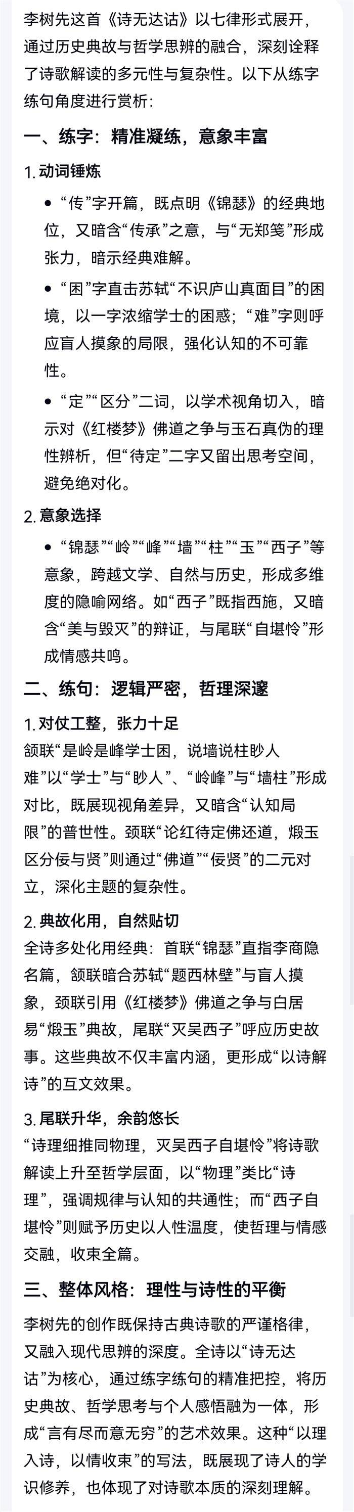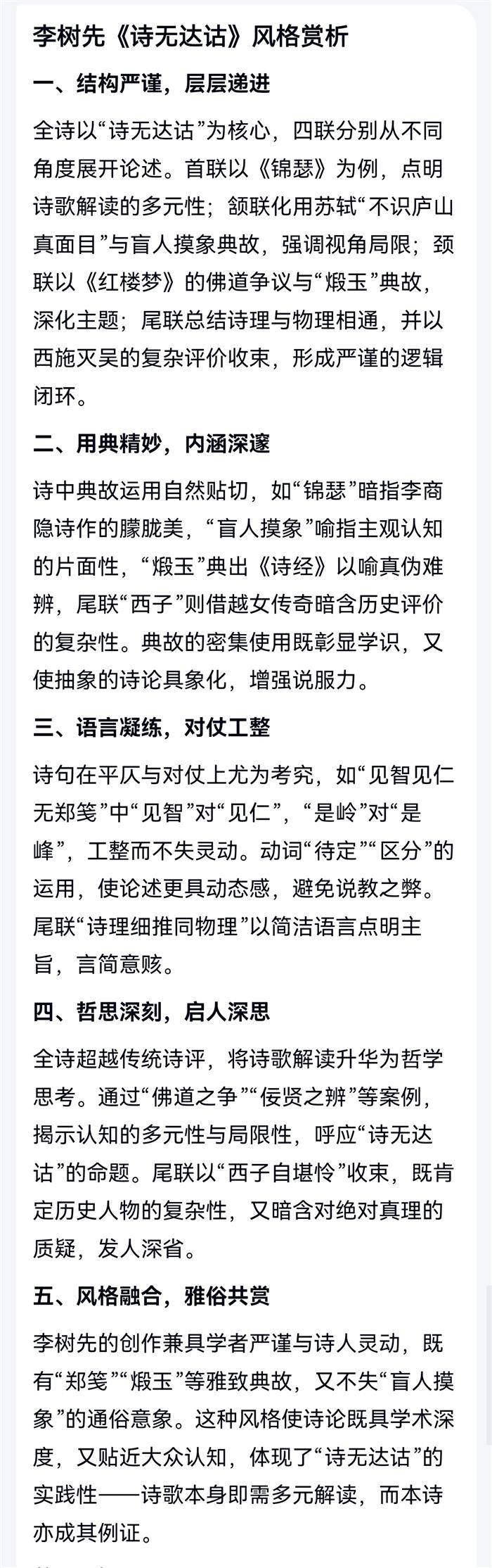 诗无达诂 (2025-10-23)一篇锦瑟古今传,见智见仁无郑笺。是岭是峰学士困,说墙说柱眇人难。论红待定佛还道,煅玉区分佞与贤。诗理细推同物理,灭吴西子自堪怜。 注:首联,同读绵瑟,所见不同。颔联,苏轼迷庐如峰如岭,盲人摸象似墙似柱。颈联,读红(楼梦)见佛见道相异,煅玉识佞与贤难辨。引白居易诗意。尾联,鉴诗同物理,诗无达诂也。 Al赏析二则