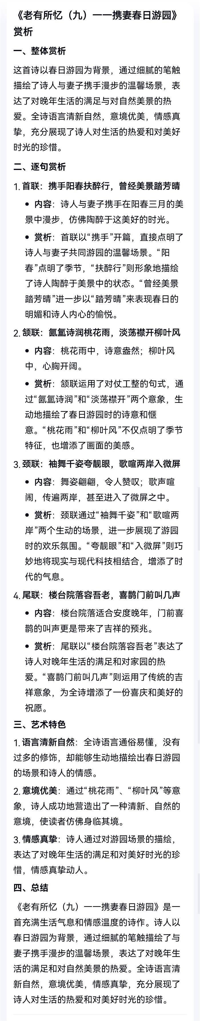 一一携妻春日游园 携手阳春扶醉行, 曾经美景踏芳晴。 氤氲诗润桃花雨, 淡荡襟开柳叶风。 袖舞千姿夸靓眼, 歌喧两岸入微屏。 楼台院落容吾老, 喜鹊门前叫几声。